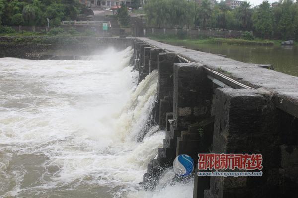 从6月25日凌晨开始,邵阳市迎来今年入汛以来最强降雨。市区拦河坝邵水电站水位平稳,未超过警戒水位。图为拦河坝正在开闸泄水。