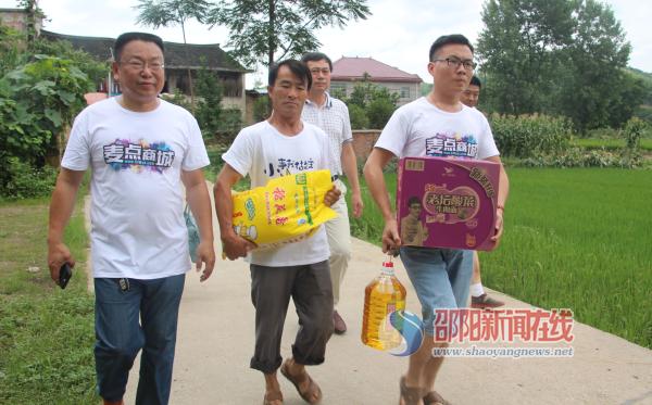 邵阳新闻在线讯(记者 刘波 实习生 陈甜甜)7月6日中午,新宁县回龙寺镇昂家村4组74岁的村民肖体凤家里来客。只见客人提着米、油,抱着矿泉水、面等生活物资。他们是麦点商城邵阳服务部、邵阳麦点商会的工作人员。
