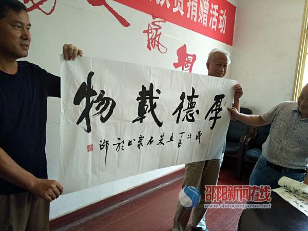 “一方有难,八方支援。此次邵阳涨大水,多地受灾严重,作为邵阳人,我们理应贡献出自己的力量。”著名老画家陈白水在捐赠现场说。此外,邵阳籍知青书画家石纪鸿老人也连夜从湘潭赶到了捐赠现场,送来了他的书法作品——《爱莲说》、《陋室铭》以及《厚德载物》。石纪鸿说:“这次邵阳的抗洪,我没能出什么力,只能在看新闻时干着急。这次书画捐赠义卖活动给了我一次回报家乡的机会,我很开心,所以昨晚特地赶回了邵阳。”