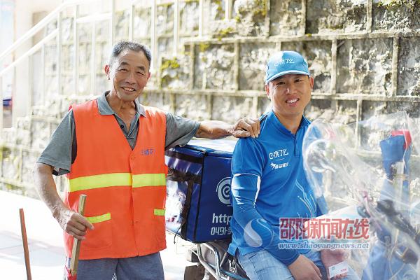 在市委附近送餐的外卖哥和环卫工人。