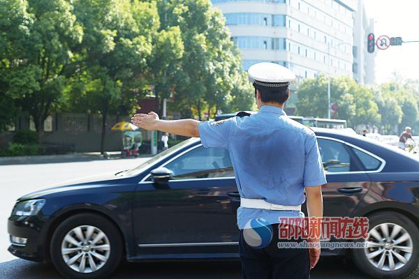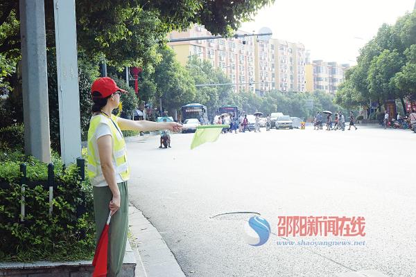 烈日下,正在市区宝庆中路指挥的交通劝导员。