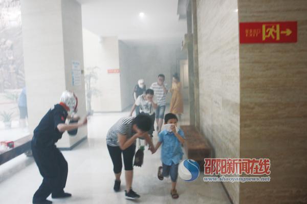邵阳新闻在线讯(记者 陈贻贵 通讯员 陈勇坚 王宁 张思琴)一阵短促的铃声划破了宁静,场馆内开始播报紧急疏散的通知。“游客”和工作人员听到警铃声后,在面戴消防面具的安保人员的指挥下,手捂口鼻,微弓身体,穿过阵阵浓烟从消防楼梯跑下来,有秩序并迅速地向一楼大厅疏散。