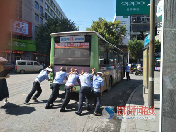 邵阳新闻在线讯(记者 刘波 通讯员 曾梅妮)7月24日10时许,邵阳市区五一南路电信公司路口,双清交警大队的交、协警一起将发生故障的公交车推往路边。