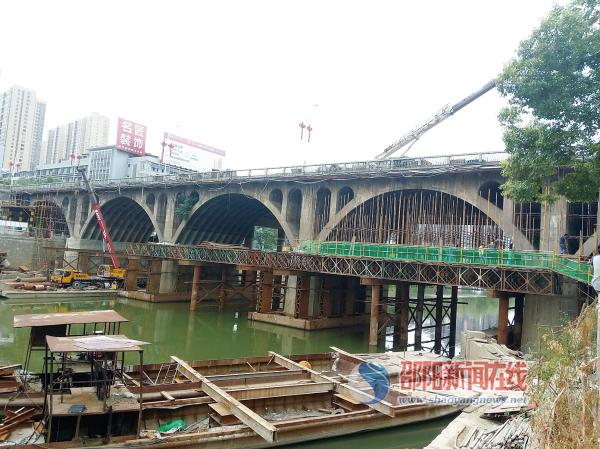 邵水桥始建于1965年,因年代久远,桥梁拱肋开裂严重,桥台水平出现倾斜裂缝,桥墩发生水下掏空,已经被评定为四类危桥,必须进行加固维修改造。从4月24日开始,市公用事业管理局组织施工队伍对邵水桥下部结构进行施工,加固桥墩,增加套箍;6月23日零时起,邵水桥进入北幅封闭施工阶段;6月24日起,邵水桥上部维修改造施工正式开始。