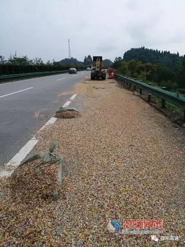 当日上午9时许,省高管局邵阳管理处大水养护所巡逻人员巡逻至沪昆高速邵怀段K1287+400至K1286+800处,看到左半幅路面一片色彩斑斓。见此,工作人员立即将车辆打开警示灯,并立即下车查看。原来,路面上有大量的彩色塑料颗粒,覆盖了行车道和应急车道,严重影响行车安全。