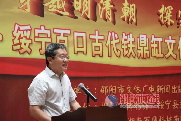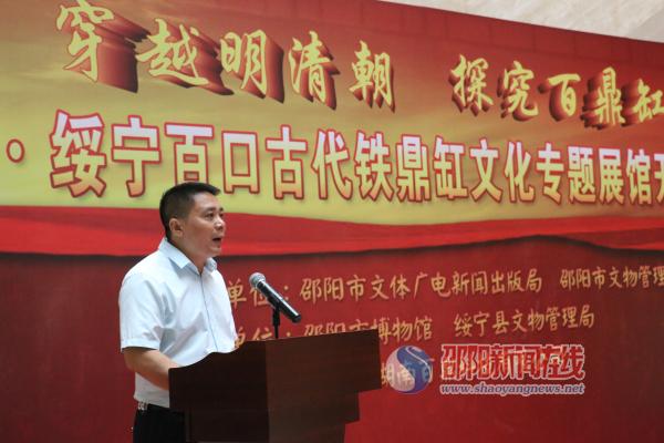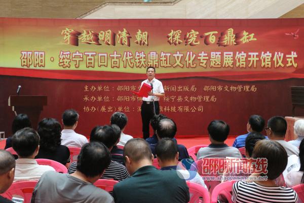 邵阳新闻在线讯(记者 陈贻贵 杨敏华 欧阳剑锋)“铁鼎缸是古代文明的传承,数量之多,年代之久,实为罕见,让人大饱眼福!铁鼎缸上面有花纹、铭文等,对研究绥宁当地的民间民俗文化有重要的参考价值。”8月30日上午,参观展出的绥宁百口古代铁鼎缸后,绥宁籍的湘潭大学文学与新闻学院副教授周建军如是感慨。