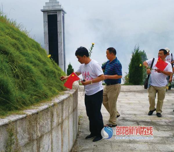 早上7时许,大家携带国旗、鲜花、香烛等,统一着装,从市区出发。经过近两个小时的车程,来到位于江口镇的陆军第七十四军湘西会战阵亡将士纪念塔。在这里,大家虔诚地摆好香烛、花篮、酒等祭品,全体肃立,向抗日烈士默哀三分钟,网友代表“邵阳老酒”等分别向先烈敬香、祭酒、敬献花篮。网友“府门口的狮子”饱含热泪献上了自撰的祭文。随后,大家又辗转于青岩山等山间,来到当年的部分战斗现场及站前指挥所,聆听当地老人对历史的追忆。同时,看望了“雪峰山会战”的部分幸存老兵。期间,大家还来到怀化市溆浦县龙潭镇抗日阵亡将士陵园,祭拜了阵亡将士。