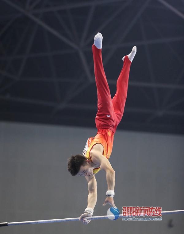 9月7日,第十三届全运会体操单项决赛男子单杠决赛在天津市开展激烈争夺。参加本次比赛的八名选手在决赛中均有出色发挥,难度也有逐步增加,排在第四位出场的山东队选手张成龙完成动作干净利索,获得了全场最高的6.6的难度分和8.133的完成分,最终以14.733分夺得冠军,邵阳籍选手谭迪难度分6.1,完成分8.333分全场最高,以总成绩14.433分获得亚军。
