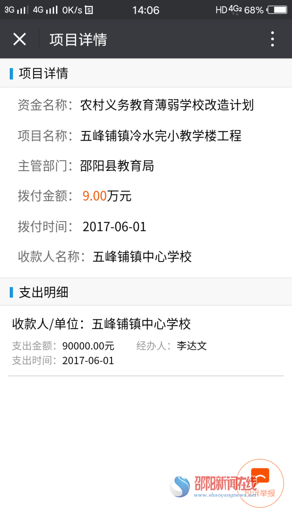 邵阳新闻在线讯(记者 杨波)11月14日上午,湖南省省市县三级“互联网+监督”平台正式上线运行。这标志着扶贫和民生领域资金监管将实现全公开透明。记者通过扫码进入了微信公众号,从微信公众号中打开了邵阳县五峰铺镇冷水村的民生资金项目和扶贫资金使用情况,资金使用去向一目了然。省“互联网+监督”平台的上线,通过互联网技术和信息化手段加强了民生资金项目监管,群众足不出户就知道了花在哪里。