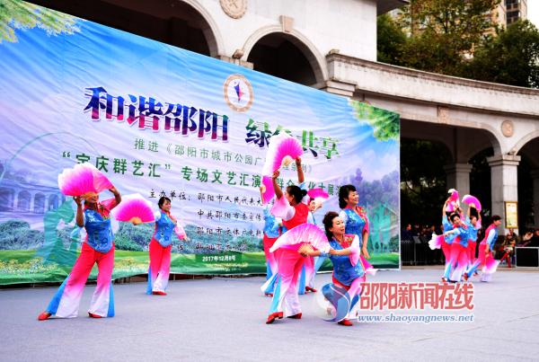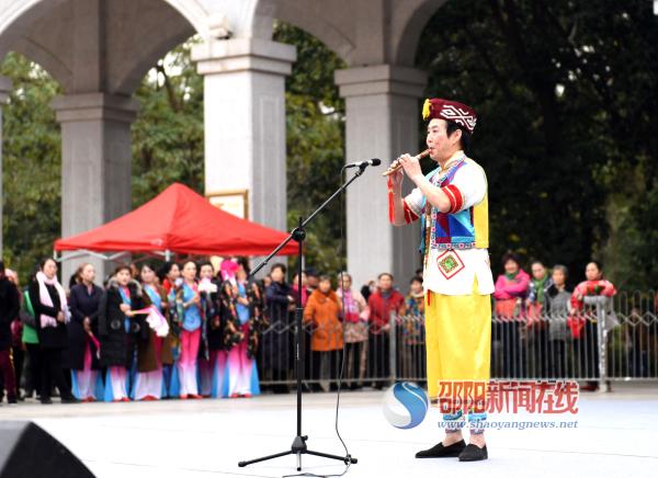 邵阳新闻在线讯(记者 陈贻贵 图/杨敏华)12月8日上午,“宝庆群艺汇”专场文艺汇演暨群众文化大展演在市区城南公园精彩上演,精彩演出赢得掌声阵阵、喝彩不断。演出以“和谐邵阳绿色共享”为主题,在宣传推广《邵阳市城市公园广场管理条例》的同时,为市民献上了一场精彩的文化盛宴。展演活动由市人大常委会、市委宣传部和市文体广新局主办,市文化馆承办。演出在激情动感的群舞《溜溜的康定溜溜的情》中拉开序幕。男生小组唱《游击队之歌》把观众一下子带入战火纷飞的抗战岁月,令现场观众热血沸腾;邵阳县黄亭市镇政府干部张泉带来了他拿手的综合才艺展示,气势磅礴、旋律奔放的二胡独奏《赛马》、诙谐搞笑的板胡演奏《猪八戒相亲》、悠扬悦耳的竹笛演奏《骏马奔驰保边疆》引爆全场;朗诵《邵阳,我们的家》展现出我市近年来发生日新月异的巨大变化,表达了人们对家乡的热爱。精彩的节目接连不断,健身球表演、弦乐六重奏、独唱、侗笛独奏……表演者用饱满的激情歌唱生活,用灵巧的身姿舞动人生,不时引来现场观众的掌声和喝彩。