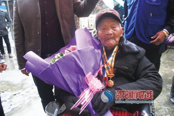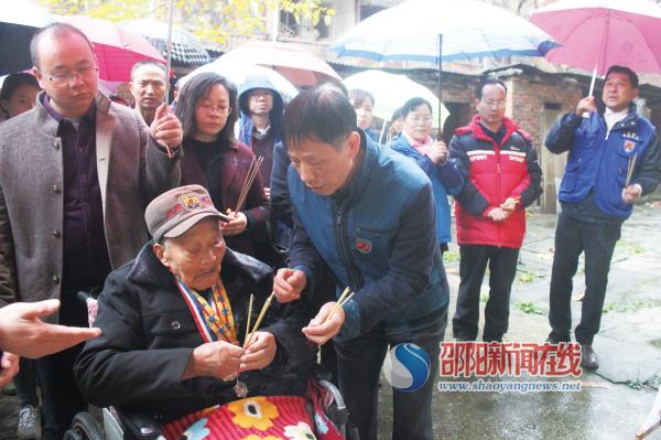 邵阳新闻在线讯(记者 伍洁)12月13日,是第四个南京大屠杀死难者国家公祭日。当天13时许,户外下着小雨,在大祥区戴家坪临时农贸市场旁的一栋楼房外却显得庄严肃穆,由百岁抗战老兵曾瑞田发起的纪念南京保卫战殉国战友的民间祭奠活动在此举行。来自邵阳市区的关爱抗战老兵志愿者和邵阳学院志愿者共80余人自发参加这场民间祭奠活动。