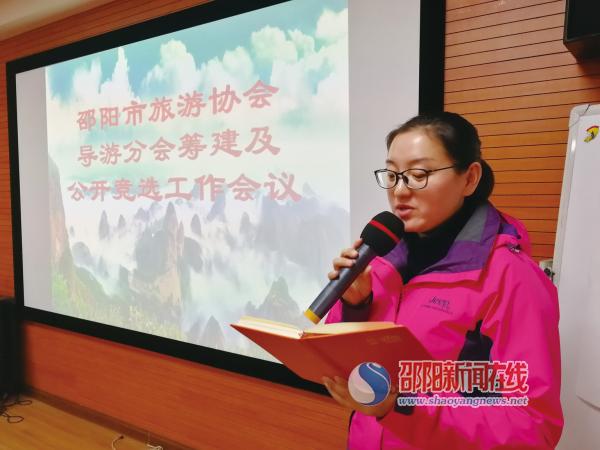 2017年12月28日,市旅游协会组织全市优秀导游代表公开竞选产生了市旅游协会导游分会会长、副会长和秘书长,正式组织成立导游分会。图为康辉旅游导游林欣在发表竞聘演说。欧阳德珍摄