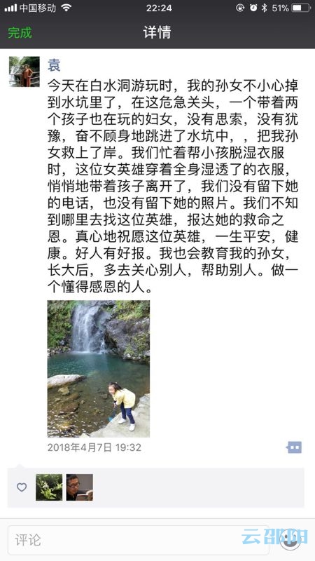 “希望能够通过媒体帮忙,找到救我孙女的好心女子,我们全家想当面感谢她。”4月10日,娄底市冷水江的袁愈云女士致电本报,请求帮助寻找4月7日在新邵县白水洞救了自己孙女的好心女子。