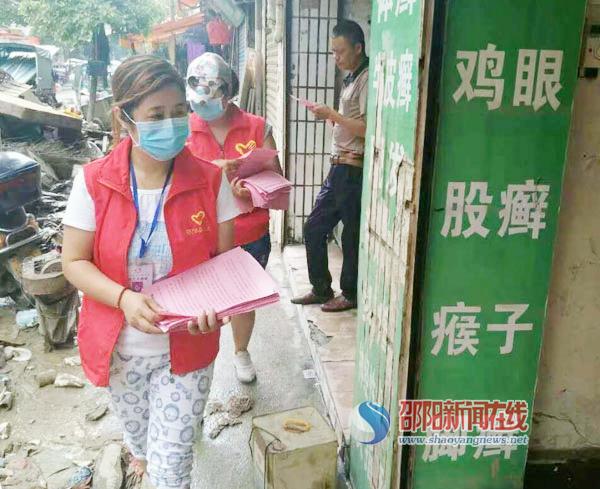 2017年洪灾过后,肖桂娥(前)和义工在街上发放防疫宣传资料