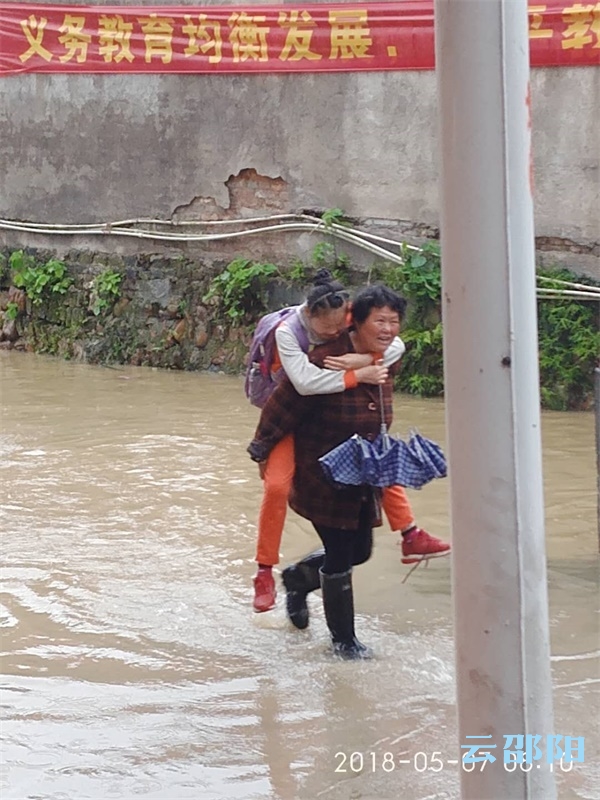 5月7日早上7时30分,家住西岩镇金沙村56岁妇女罗美丽看到不少学生被堵路边。望着孩子们焦急的眼神,罗美丽二话不说,穿上雨靴,踏入水中,背着路边学生涉水横渡校门,让学生顺利进入学校上课。当时,天空下着中雨,尽管背上的孩子给她打伞,但终因雨水太大,罗美丽全身衣裤都被淋湿。不到一个小时时间,她冒雨往返水中背送了9名学生。