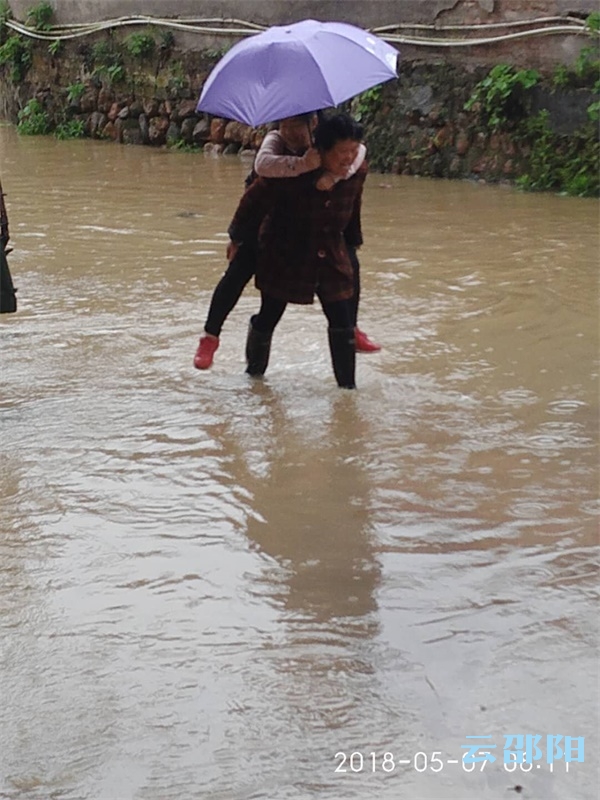 云邵阳讯(记者 伍洁 通讯员 戴方财 宋阳玲)5月6日晚上,城步苗族自治县西岩镇遭受暴雨,一夜之间河水上涨。雨水淹没了通往西岩中学北校门的马路,校门通道变成了河道,造成从北校门进出的学生无法进入校门上学。