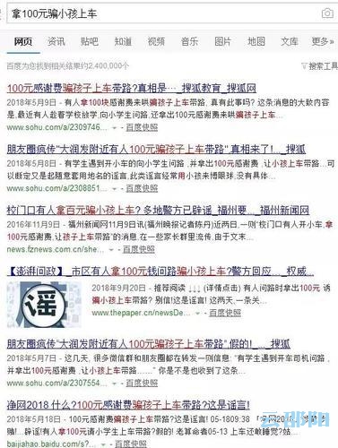 记者打开百度,输入了关键词“拿100元骗小孩上车”,相关搜索结果达240多万条,仔细一看,每条搜索结果里除事件发生地点不一样,其他内容都差不多。