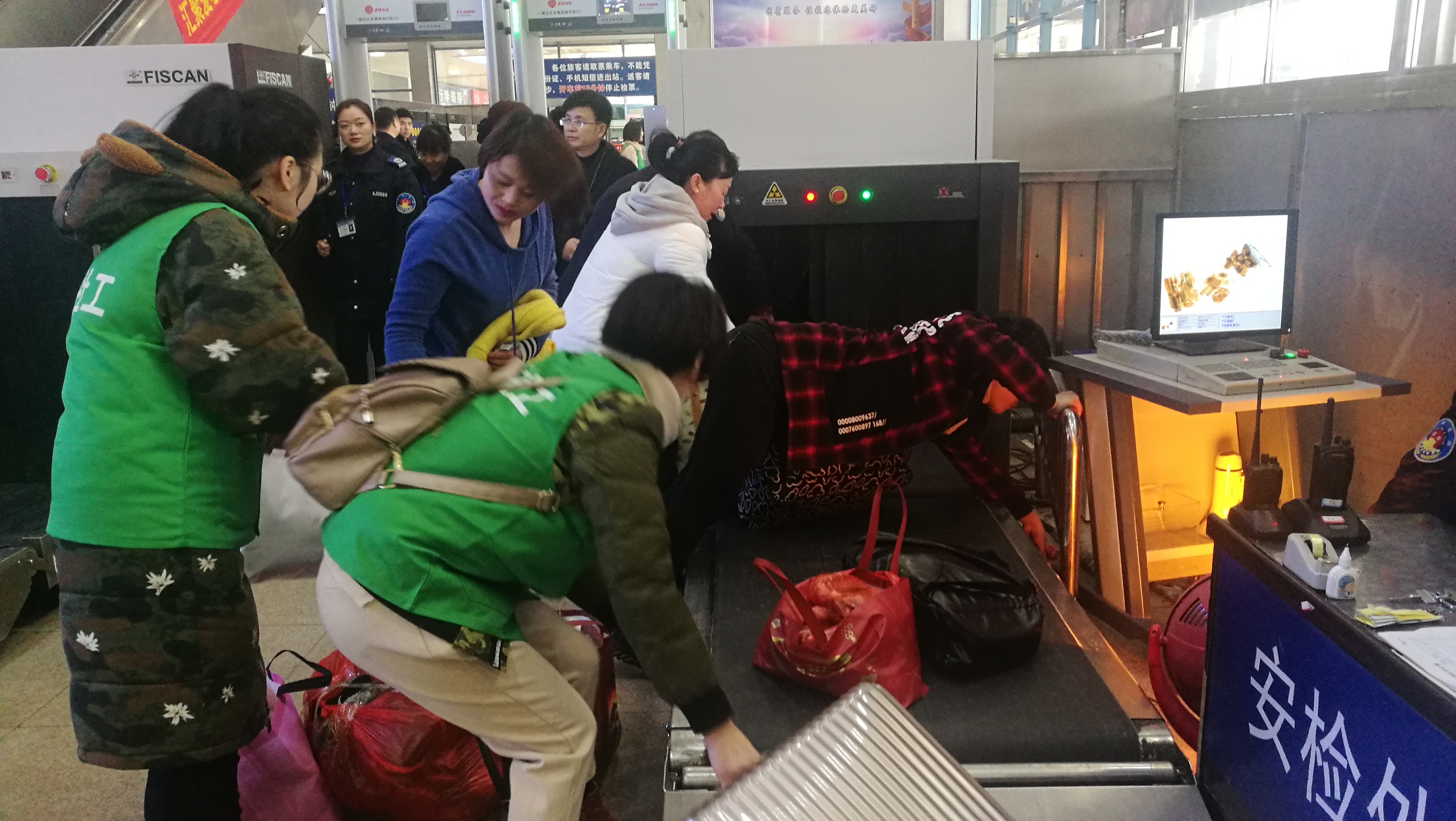 因电梯纤维修,志愿者帮助旅客将行李提到候车室。