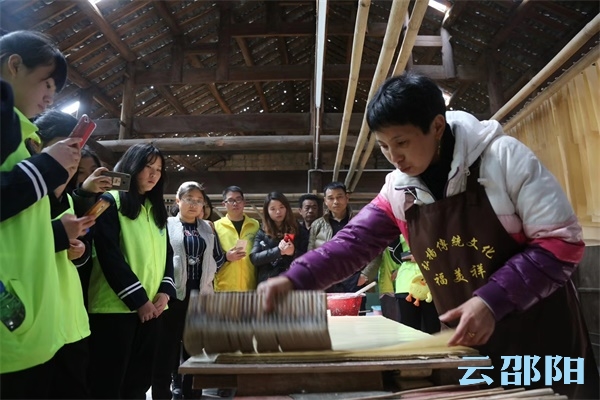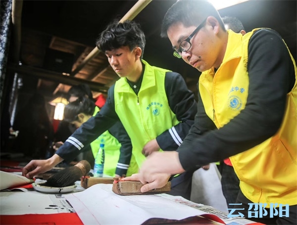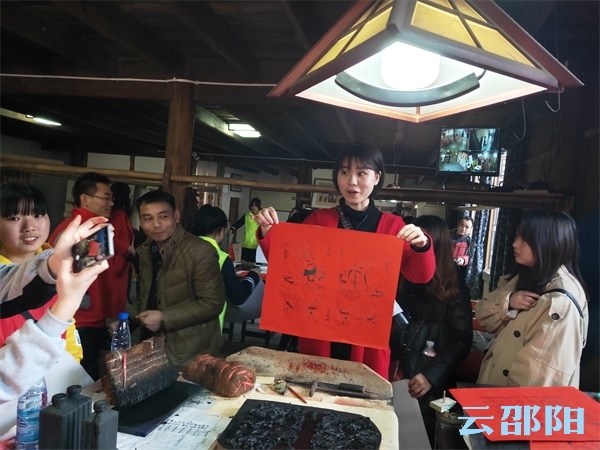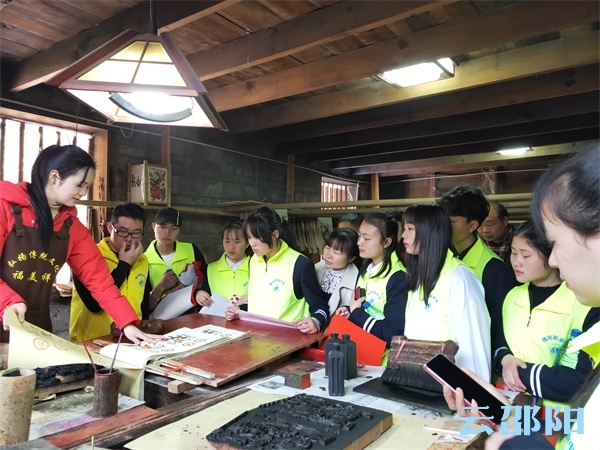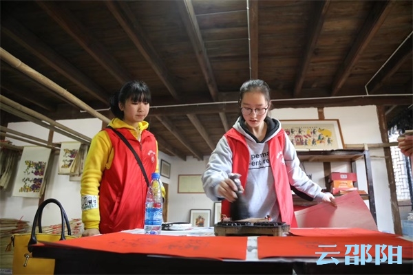 云邵阳客户端3月13日讯(全媒体记者 陈贻贵)3月12日、13日,邵阳学院艺术设计学院、隆回职业中专的师生们先后来到隆回县滩头木版年画福美祥作坊,在滩头年画省级传承人尹冬香及其女儿肖扬的带领下,了解年画的印制步骤、操作技巧和注意事项,在动手印制过程中体验和感受传统技艺的魅力。