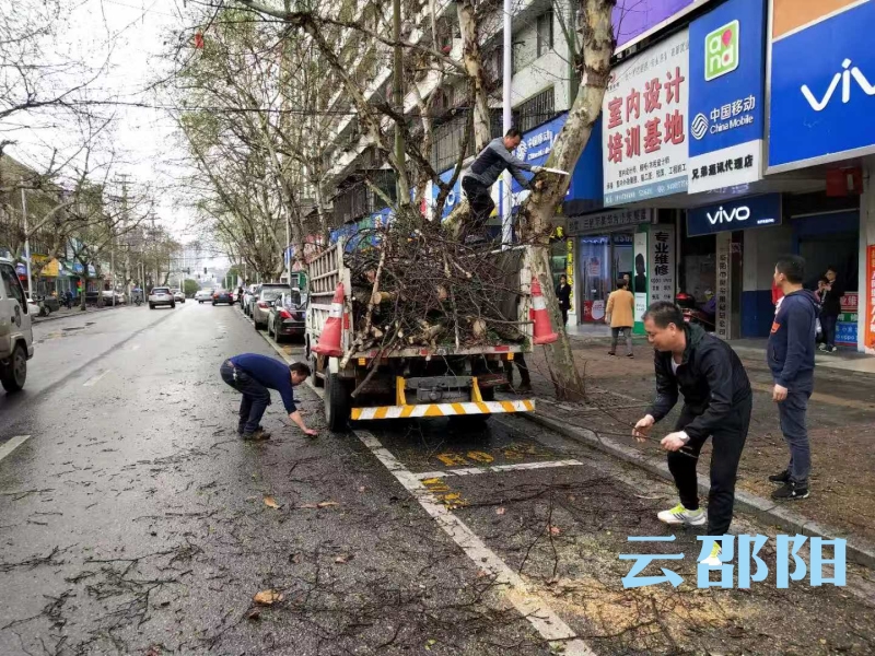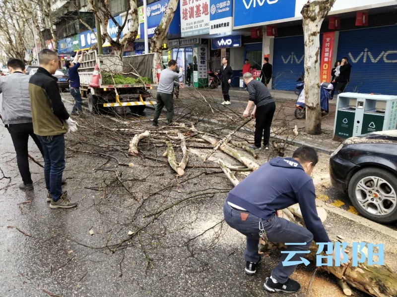 得知情况后,市街道绿化所迅速组织应急抢险组赶往现场。16时,工作人员到达现场开始清理作业。他们一边把砸中小车的树干锯断,一边清运树枝,及时排除险情,恢复交通秩序。
