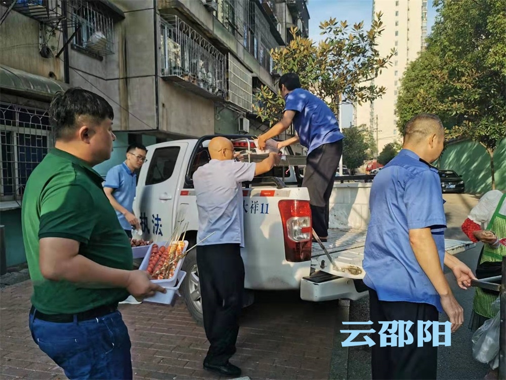 城管工作人员收缴违规经营摊点的物品