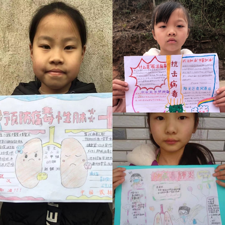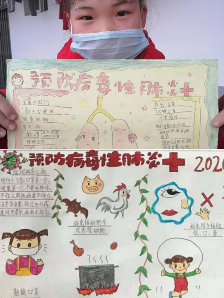 学生们纷纷将学习到的防疫知识制作成手抄报、宣传画等作品,通过小视频、照片的方式在班级微信群进行分享,大家一起抗击疫情,为中国加油!本次活动作品有《预防病毒性肺炎》《携手抗击病毒》等手抄报以及写有“武汉加油,中国加油”的宣传画等,充分展现了孩子们对新型冠状病毒感染的肺炎疫情的热切关注。
