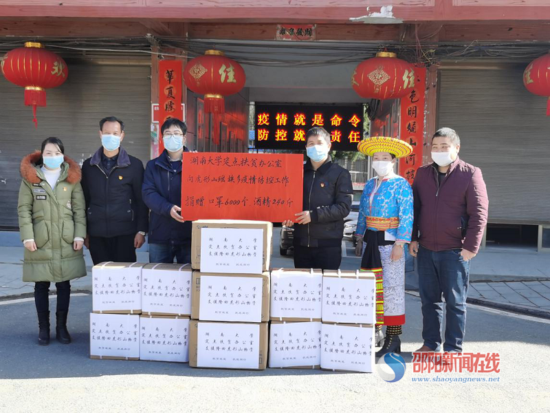 邵阳新闻在线讯(通讯员 曾盛财)隆回县白水洞村是湖南大学的定点扶贫驻村帮扶单位。2月16日,湖南大学驻隆回县虎形山瑶族乡白水洞村扶贫工作队队长刘世明代表湖南大学定点扶贫办公室向隆回虎形山瑶族乡疫情防控工作捐赠口罩6000个,酒精240斤,帮助当地群众加强后勤物资保障,助力打赢疫情防控人民战争、总体战、阻击战。图为捐赠现场。