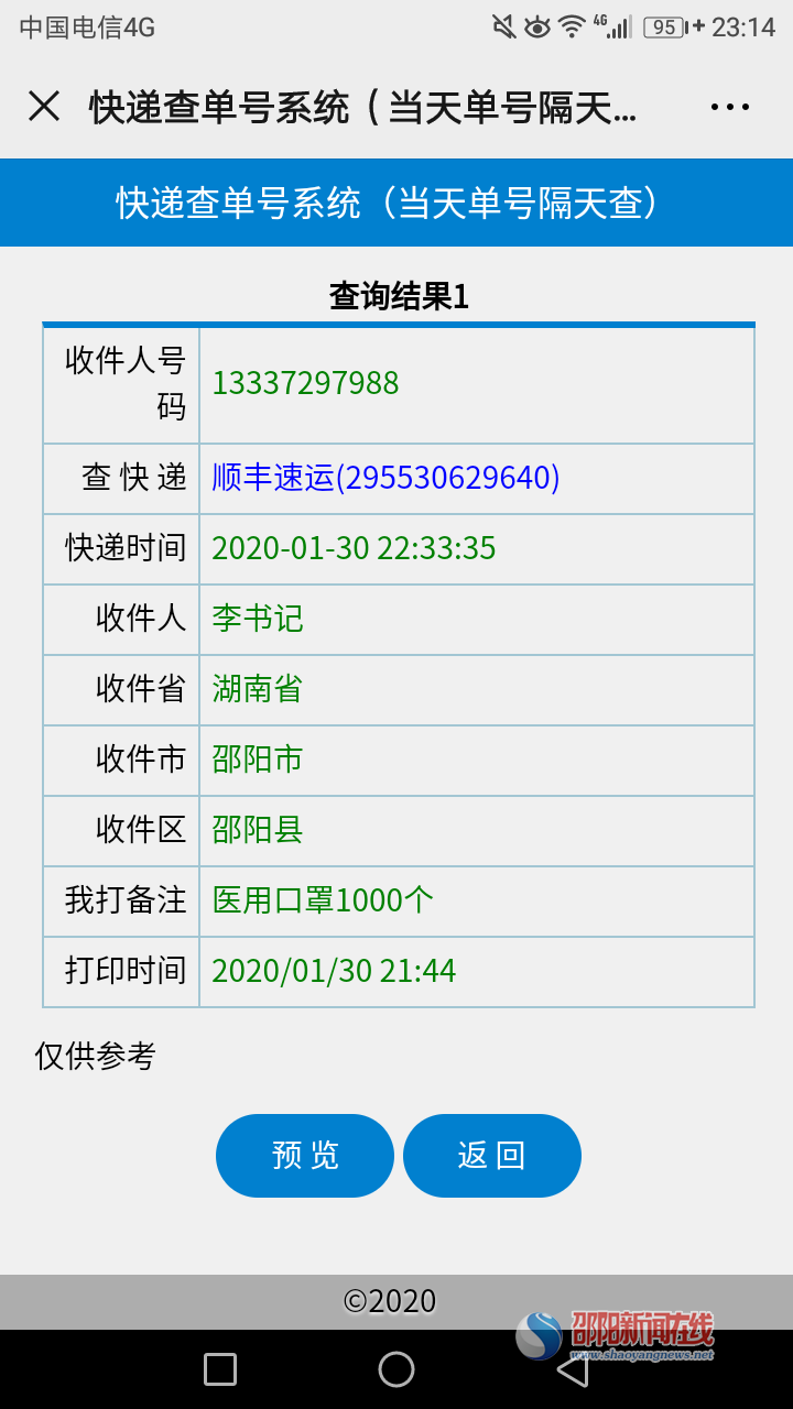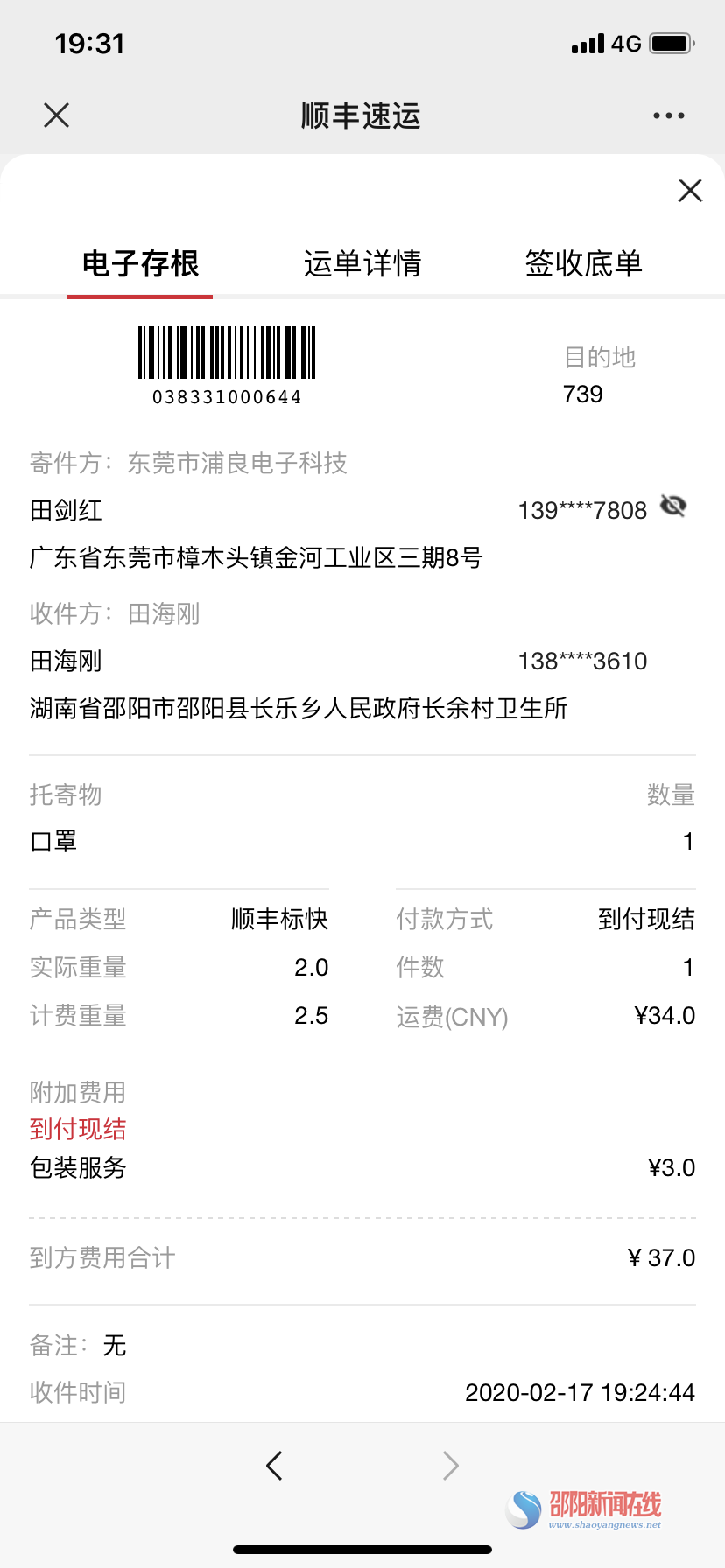 邵阳新闻在线(通讯员 杨核)2月17日,邵阳县长乐乡党委书记李小明的微信上又传来了“别样”的快递单号图,这是长乐乡长余村在东莞发展的有志人士田剑红向家乡人民捐赠抗“疫”的第五批物资快递单。