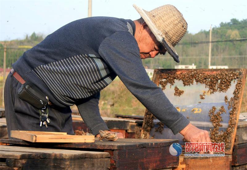 邵阳新闻在线讯(通讯员黎建成钱沸涛)3月25日,邵阳县下花桥镇千亩连片高产油菜基地里,原属贫困户、现养蜂达200余箱、年产4吨蜂蜜及蜂王浆、蜂花粉、创产值达20余万元的养蜂专业户周四寿正忙着查看蜜蜂酿蜜情况。