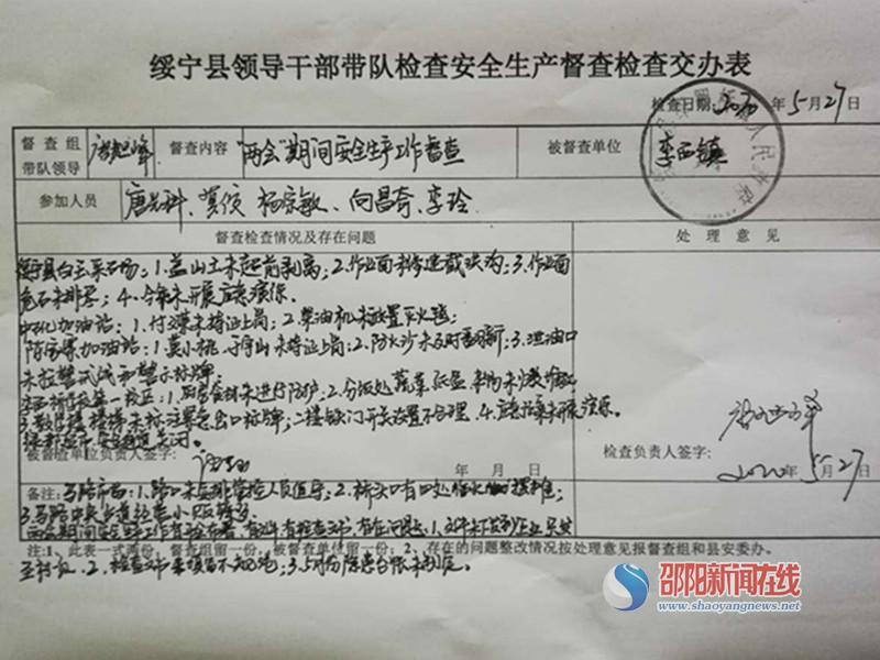邵阳新闻在线讯(通讯员 李玲)5月27日,绥宁县县委常委、组织部部长唐旭峰带领县安委办负责人到李熙桥镇督导检查安全生产工作。
