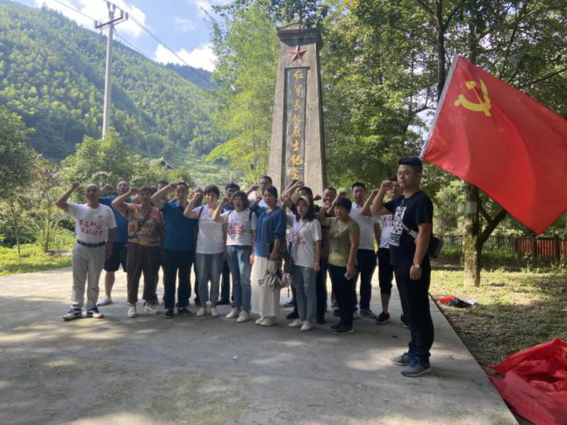在长安营镇长坪村,39名党员同志过红军桥来到红军长征烈士纪念碑前合影留念,面对鲜艳的红色党旗,跟唱了激动人心的国歌后,举起右手,重温了入党警词。大家望着耸立的纪念碑,细看着碑四周的碑文和题词,心情久久不能平静。