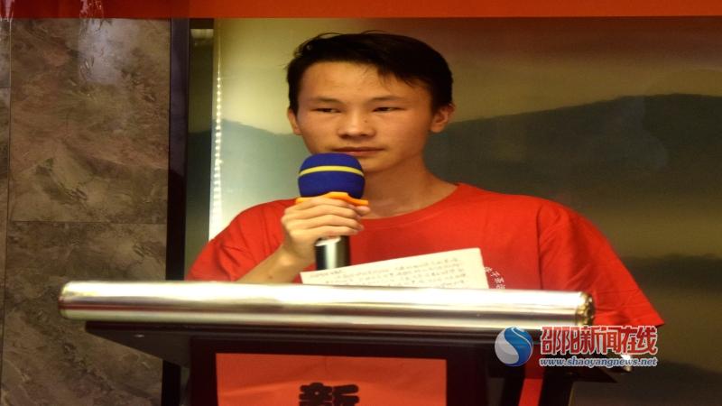 学子交流分享环节,新宁二中今年理科高考第一名、大邵学子文同学与学弟学妹们分享了自己的学习经验和受助感悟。他说,自己出生在一个特殊的家庭,生活一直处在困境中,多次面临失学,是社会各界的爱心不断接力,才使他顺利完成学业,并在爱心的感召和鼓励下努力学习,奋发图强,最终以优异的成绩考上了湖南科技大学。他还特别感谢了大邵公益一对一关爱志愿伍铜球先生,他说伍叔叔在对他的关爱中始终把他当男子汉、当兄弟一样看待,经常给予鼓励和开导,正是这样的关怀给了他无限的心灵慰藉和心理支撑,甚至更胜于物资上的帮助。