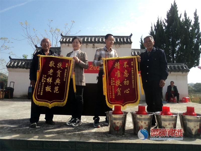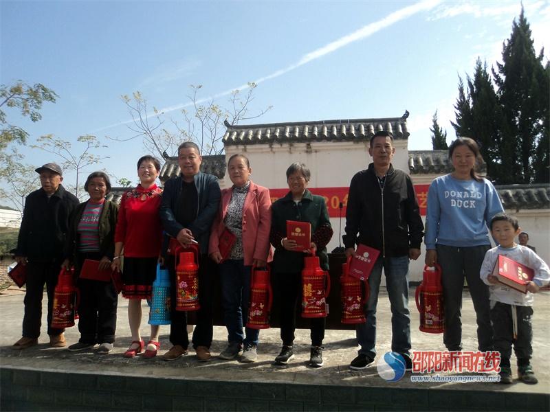 当该村为邵阳路桥、华融湘江市派帮扶工作队分别授予“扶贫典范,敬老样板”、“不忘初心,精准扶贫”锦旗,将活动推向高潮。接着,村里还为戴春桥等8名赞助企业老板颁发荣誉证书,艾芳荣等8名孝亲好儿媳、戴公平等3名老有所为贡献者颁发荣誉证书及纪念品时,赢得一阵阵掌声和喝彩声。