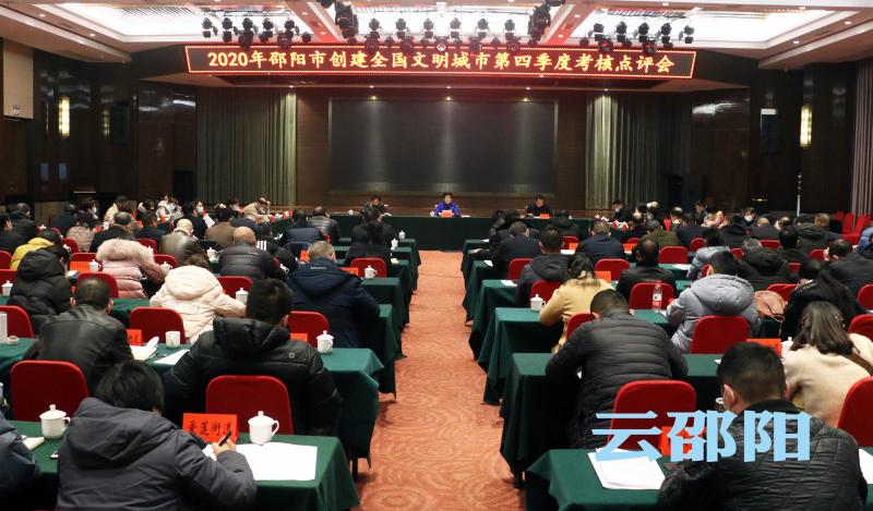 云邵阳客户端1月26日讯 (全媒体记者 刘小幸)1月26日,邵阳市召开2020年第四季度创建全国文明城市工作考核点评会,对去年第四季度各区、各责任单位创建全国文明城市工作进行点评,对下阶段创文工作进行部署。市委常委、宣传部部长、市创文指挥部副指挥长兼办公室主任周迎春出席并讲话,副市长李华和,市政协副主席郭妤出席。