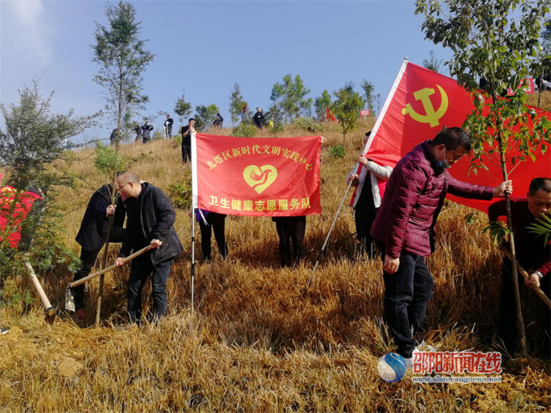 邵阳新闻在线讯(通讯员 禹长贵)2月19日,北塔区卫健局组织该系统的党员和新时代文明实践服务活动的志愿者们到陈家桥乡李子塘村开展义务植树活动,让党旗和新时代志愿者文明服务活动的旗帜在荒山变绿实践活动中迎风飘扬。