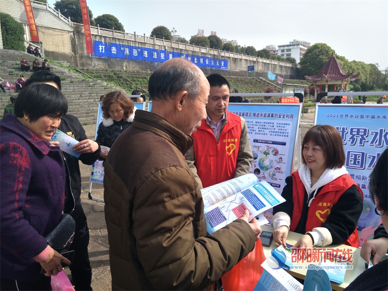 在北塔区资江望江楼前坪的集中活动现场,身穿红马甲的新时代文明实践服务志愿者通过悬挂横幅、摆放宣传展板和发放宣传资料等形式向群众宣传节水的重要性,倡议大家提高节水护水意识,积极参与到水资源保护行列中来,自觉保护资江母亲河水清岸绿,从身边小事做起,珍惜水资源,不浪费一滴水。