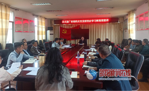 “邵阳县是革命老区县,有着厚重的文化底蕴和丰富的红色文化资源,每每想起我县党史中那群具有坚定共产主义理想的吕振羽、向暄等革命先辈的英勇事迹,都不禁热泪盈眶,学习党的历史,回顾党的光辉历程,更能感受到现在幸福生活的来之不易,也更要从学习党史中感悟和践行共产党员的初心使命..........”县宣讲团成员、县政协文教卫体和文史委员会主任朱清平进行了一场生动地微宣讲。县文旅广体局老党员唐湘鹏将党的光辉历史以近几年来党的好政策、全县文化建设发展变化,融入宣讲中,并用自身退休后不畏艰苦纪录全县传统文化历史和改革成就的故事,感召全局党员干部发扬“三牛”精神砥砺前行。