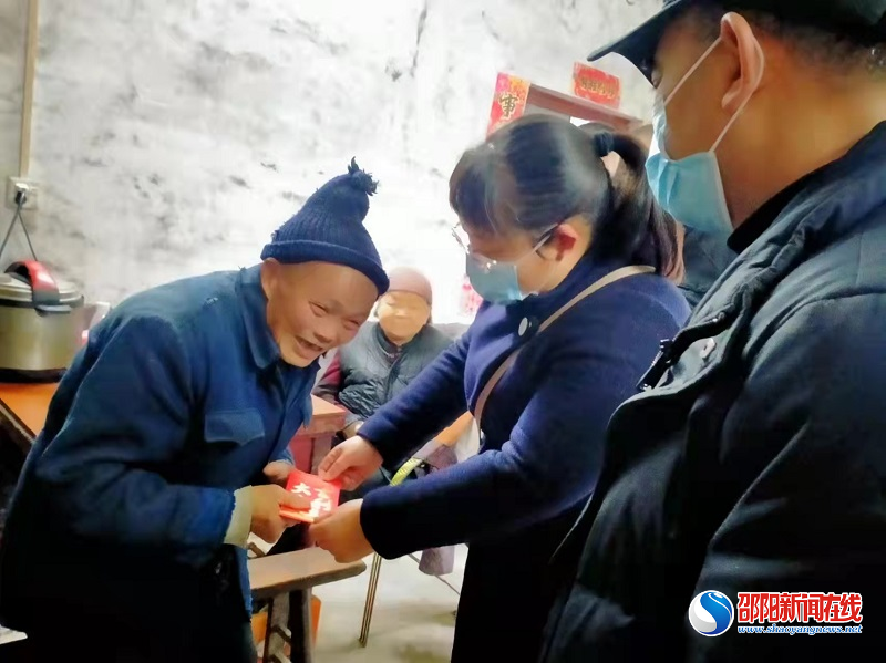 “您老要多穿点,天气冷,您老伴脚上要加盖点毯子么,冷么,您老自己用来买点喜欢的东西,过个热闹年啊”陈竞帆把慰问金送到冷堆珍的老伴手中,冷堆珍的老伴连声道谢。冷堆珍今年75岁,系2014年精准扶贫户,家里6口人。冷堆珍常年多病在身,2018年因脑溢血瘫痪卧床数月,儿子在江西务工,孙子孙女在读小学,生活一度陷入困境。后来在政府的帮助下,2019年为其申请了低保,解决了困难补助和教育补贴。帮扶干部还经常上门关心鼓励他们要树立信心、保持乐观。