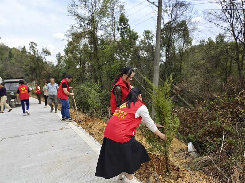 植树现场,志愿者们配合默契,有的挥锹铲土,有的帮忙扶苗,有的提桶浇水,合力栽下了一棵棵树苗,一派热火朝天的劳动景象成为一道美丽的风景线。在大家的齐心协力下,共栽植红豆杉、罗汉松、桂花树共计120棵,一棵棵新栽植的树苗错落有致、迎风挺立,为帮扶村的春天增添了生机和活力。