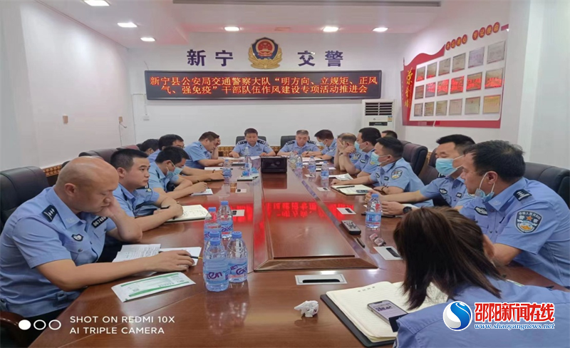 邵阳新闻在线讯(通讯员 陈贵清)5月18日,新宁县公安局交通警察大队召开“明方向、立规矩、正风气、强免疫”干部队伍作风建设专项活动推进会,大队班子成员及全体中队长参加了会议。大队教导员主持会议。
