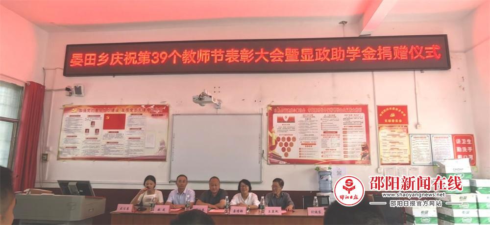 邵阳日报·邵阳新闻在线讯(通讯员 刘剑英 邓琛)9月8日下午,在第39个教师节来临之际,武冈市晏田乡隆重举行第39个教师节表彰大会暨显政助学捐赠仪式。晏田乡乡长唐倩颖、副乡长刘迪东、“显政教育助学金”的晏田中学原校长王显政、中心学校校长欧武出席颁奖仪式,中心学校及各校负责人、优秀教师,优秀班主任,优秀学生出席本次活动。乡党委副书记、驻村办主任柳小长主持会议。