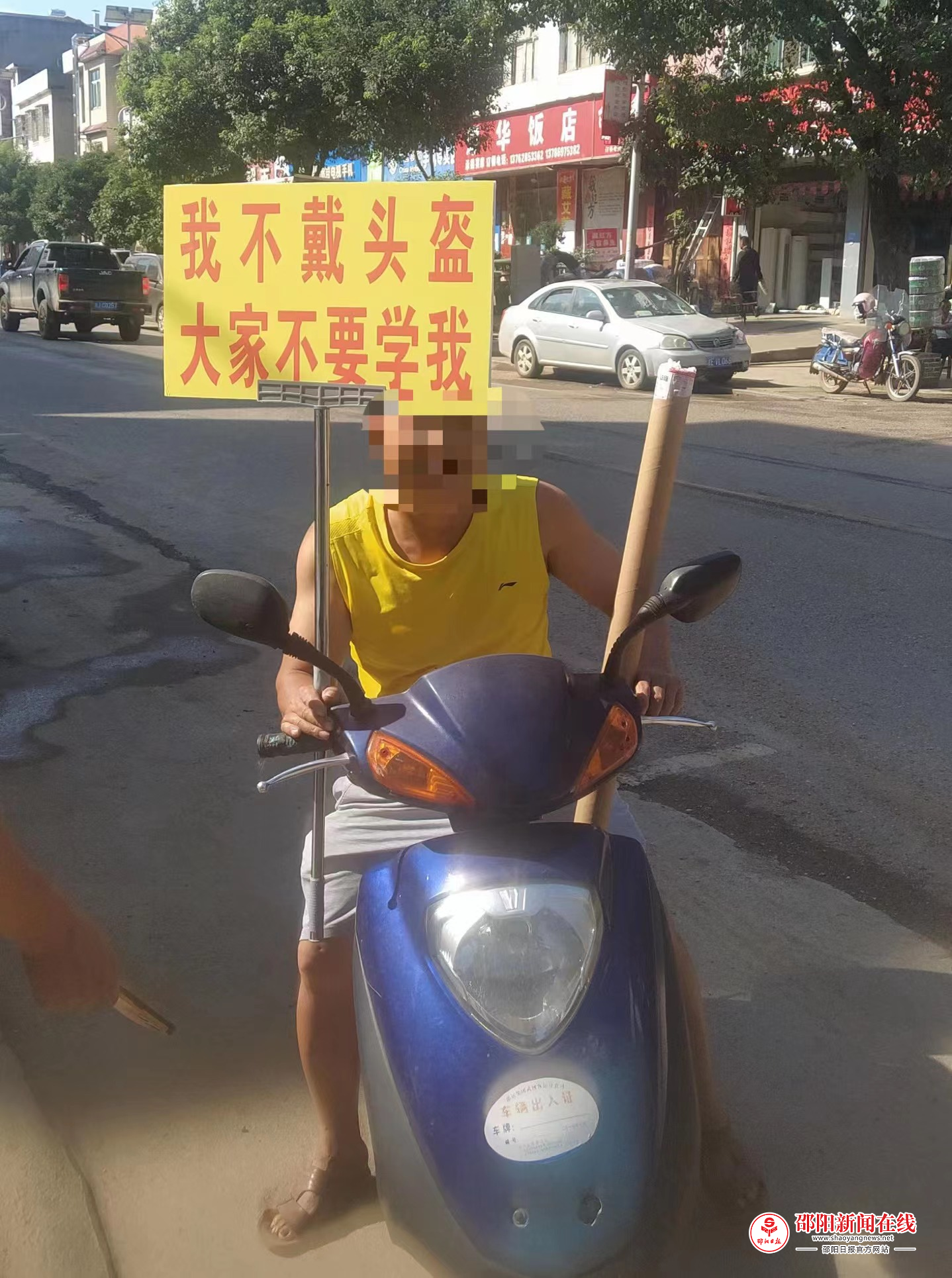 在双牌岔路口,部分群众在交警的监督下,高高举起“我不戴头盔,请大家不要学我”等文字的宣传牌,还表示以后要长记性戴头盔了。据悉,举这些牌的都是驾驶摩托车或电动车不佩戴安全头盔的等轻微交通违法者,执法人员柔性执法,做到不罚款。但当事人要在路口举牌宣传,并找到下一个不戴头盔的人代替。这一方式也让更多的人自觉做文明交通的倡导者和践行者,达到“发现一个,教育一片”的目的。