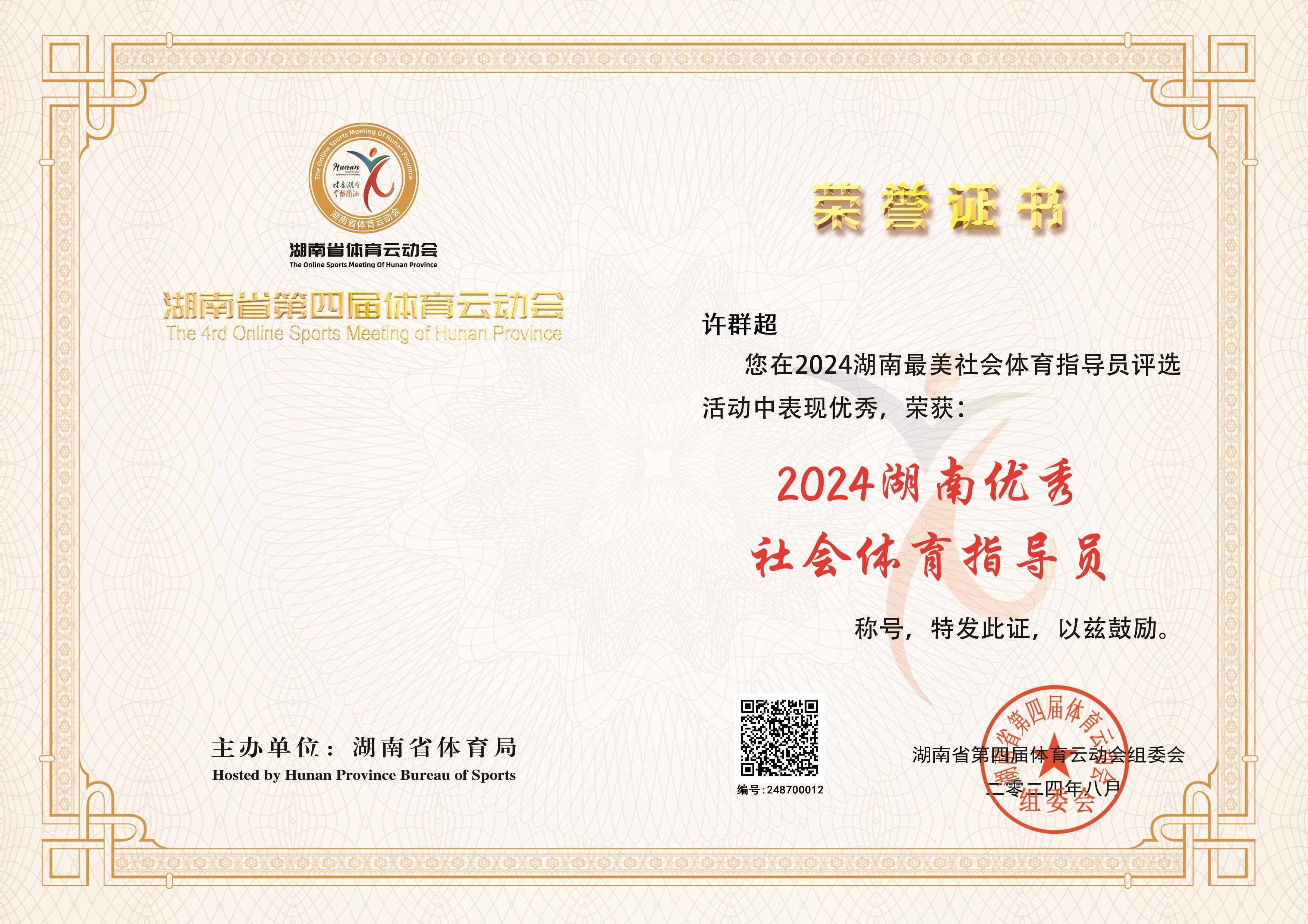 邵阳日报·邵阳新闻在线讯(通讯员 陈甫春 钱玉洁 阳柳 胡胜广)由湖南省体育局主办,中国体育彩票公益金支持的“湖南省第四届体育云动会———2024年湖南最美社会体育指导员评选活动”圆满结束,经过综合评选,隆回县社会体育指导员协会会长许群超被评为2024湖南省优秀社会体育指导员荣誉称号。