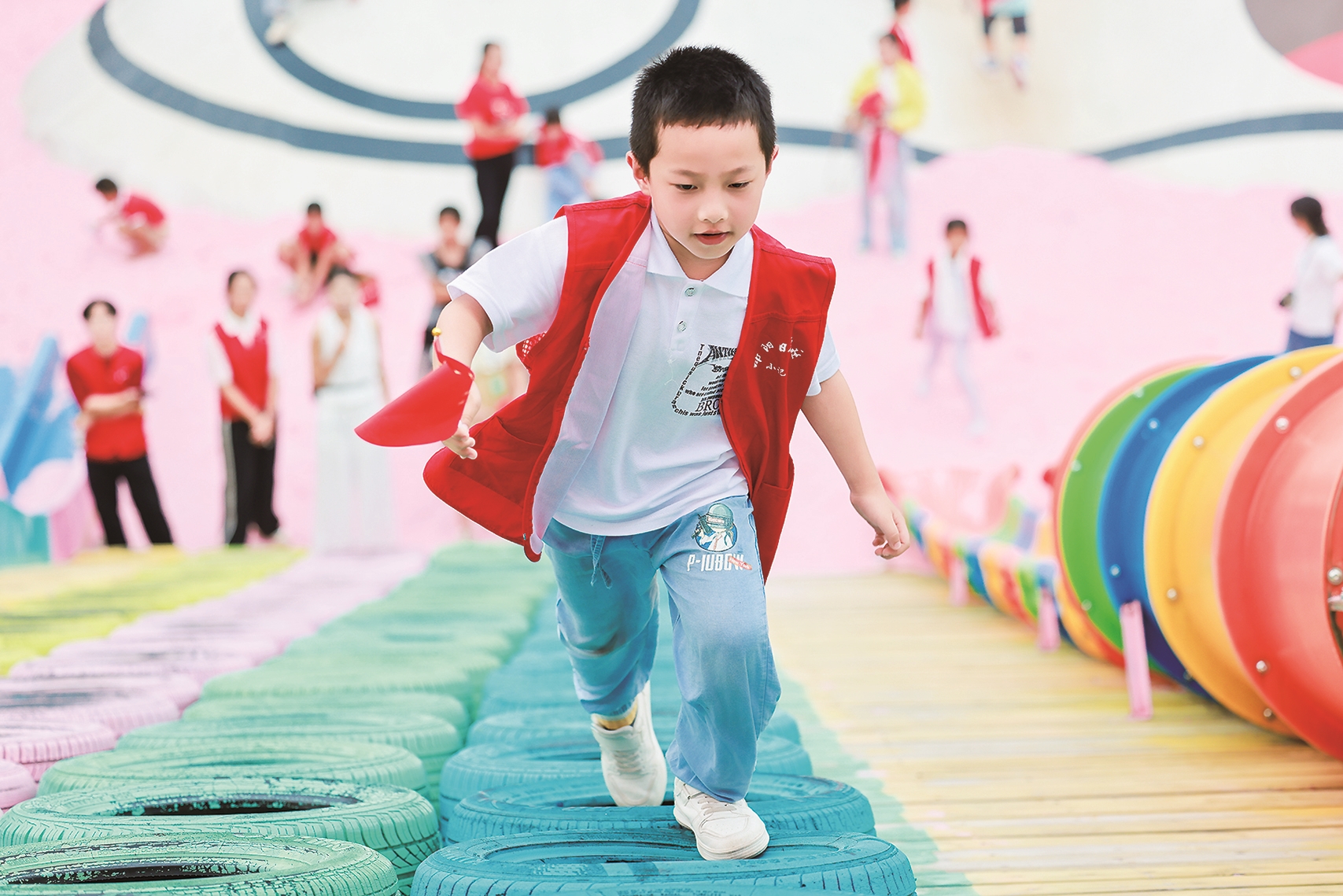 随后,小记者们按队别开展的个人挑战赛——“我是拼图小能手”及团队协作的“趣味接力赛——我是红旗小卫士”,将活动推向高潮。在拼图区,小记者们屏息凝神,指尖翻飞,力求在最短时间内将“庆国庆”主题拼图的碎片完美复原。而在彩虹滑道旁的接力赛中,小队员们化身“红旗卫士”,手持红旗,敏捷地穿越轮胎障碍,将旗帜稳稳插到终点。紧张的接力、默契的配合,充分体现了团队协作的力量和守护国旗的荣誉感。