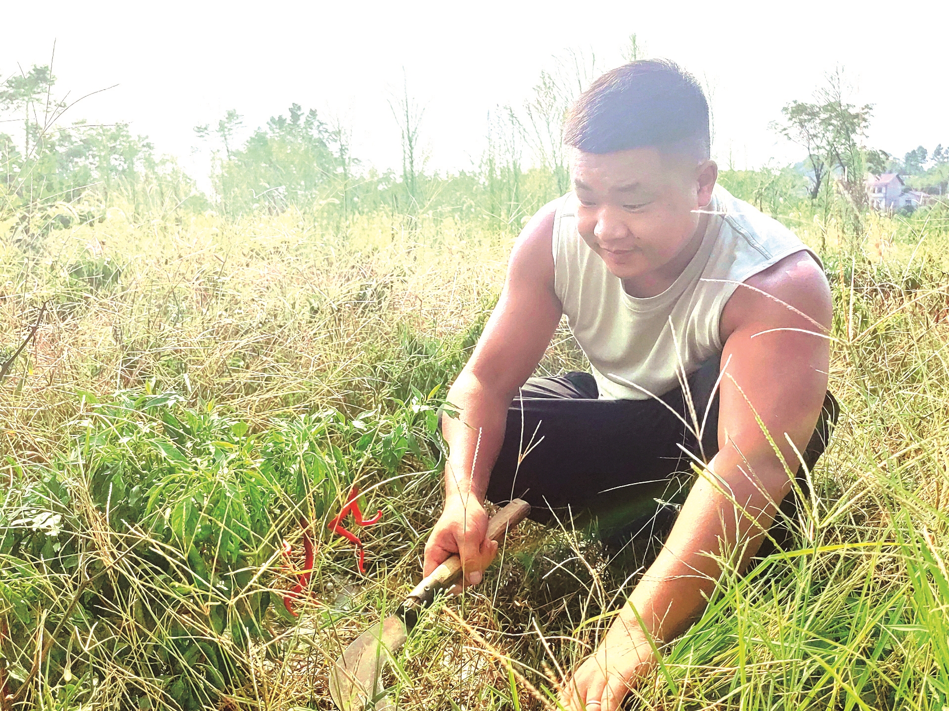 10月7日15时许,邵阳县谷洲镇杨柏村村民夏勇头戴斗笠,手提镰刀,穿过丛丛杂草前往一片辣椒地。秋辣椒被晒得有些蔫。夏勇捏了几个看,眼里带光:“再等几天,天气凉快些,又能结出一茬了。”说完他抡起镰刀清理杂草,汗珠子顺着脸颊直往下滚。