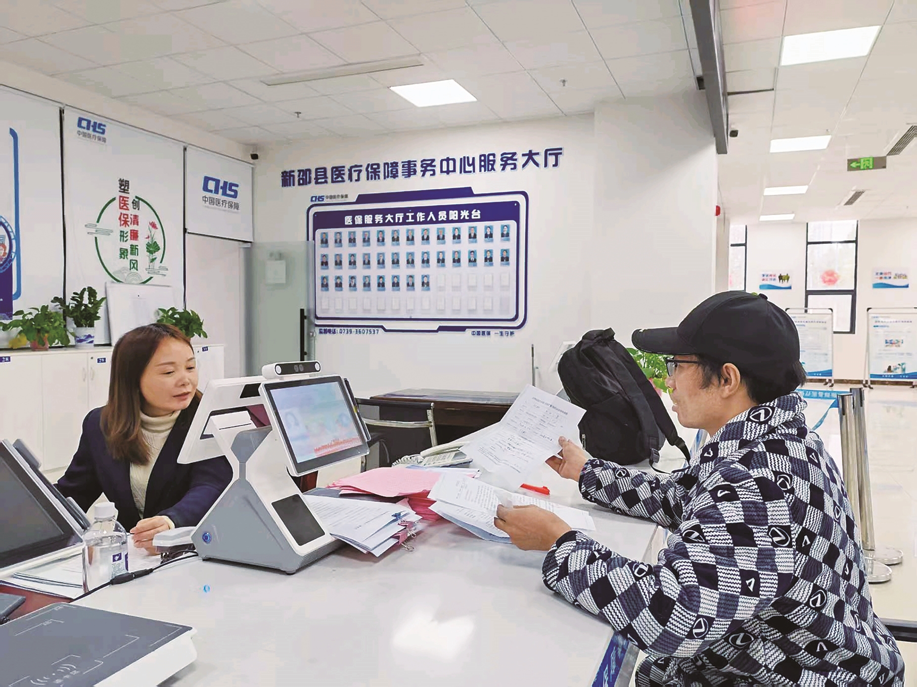 新邵县医疗保障事务中心服务大厅工作人员为群众办理业务。