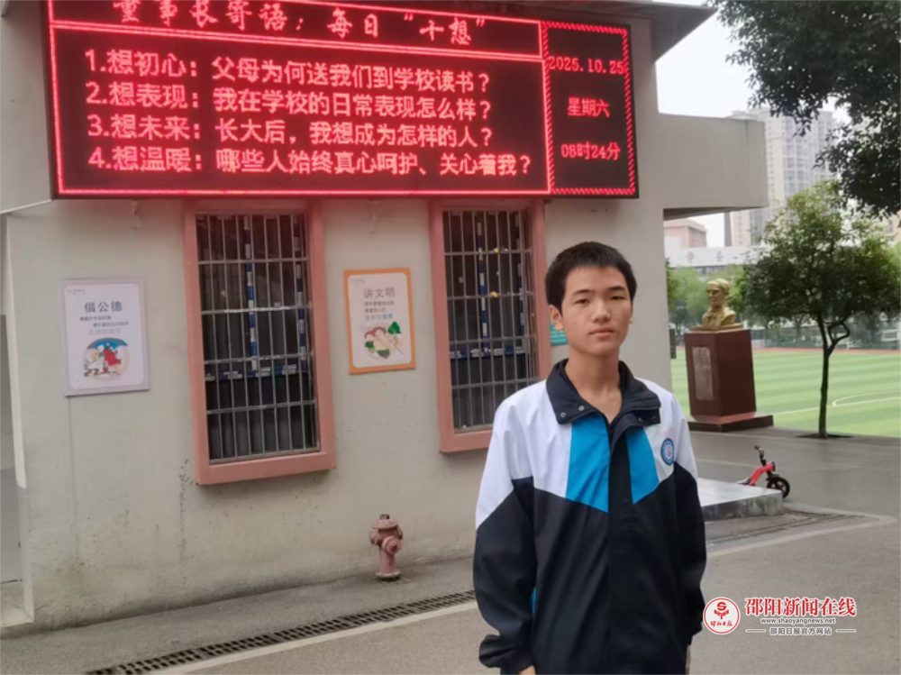 邵阳日报· 邵阳新闻在线讯(通讯员 谢正旺、胡益娟、赵丽娟)在邵阳市邵东经纬学校那充满活力与书香的校园里,总有一道独特的身影吸引着众人的目光,那便是2508班的赵轩。他身着一件别具一格的校服,后背上用黑色画笔精心勾勒出一幅完整的中国地图,这幅特殊的“地图校服”,宛如一颗炽热的爱国之心在熠熠生辉,不仅承载着一名青年学子对祖国最深沉、最炽热的爱,更成为校园里一道令人瞩目的亮丽风景线。