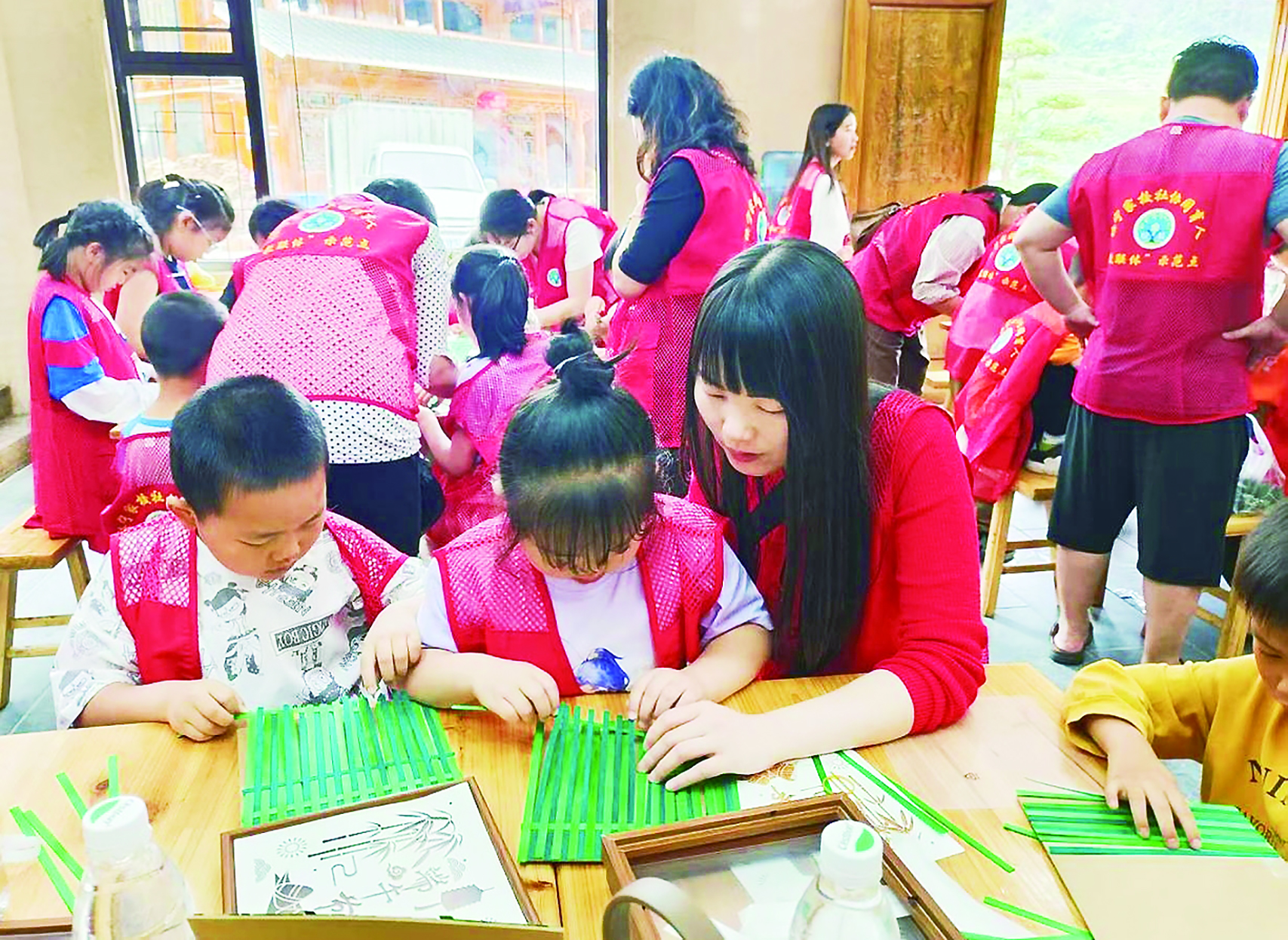 ▶绥宁同心圆研学基地内,小朋友学习非遗竹编。