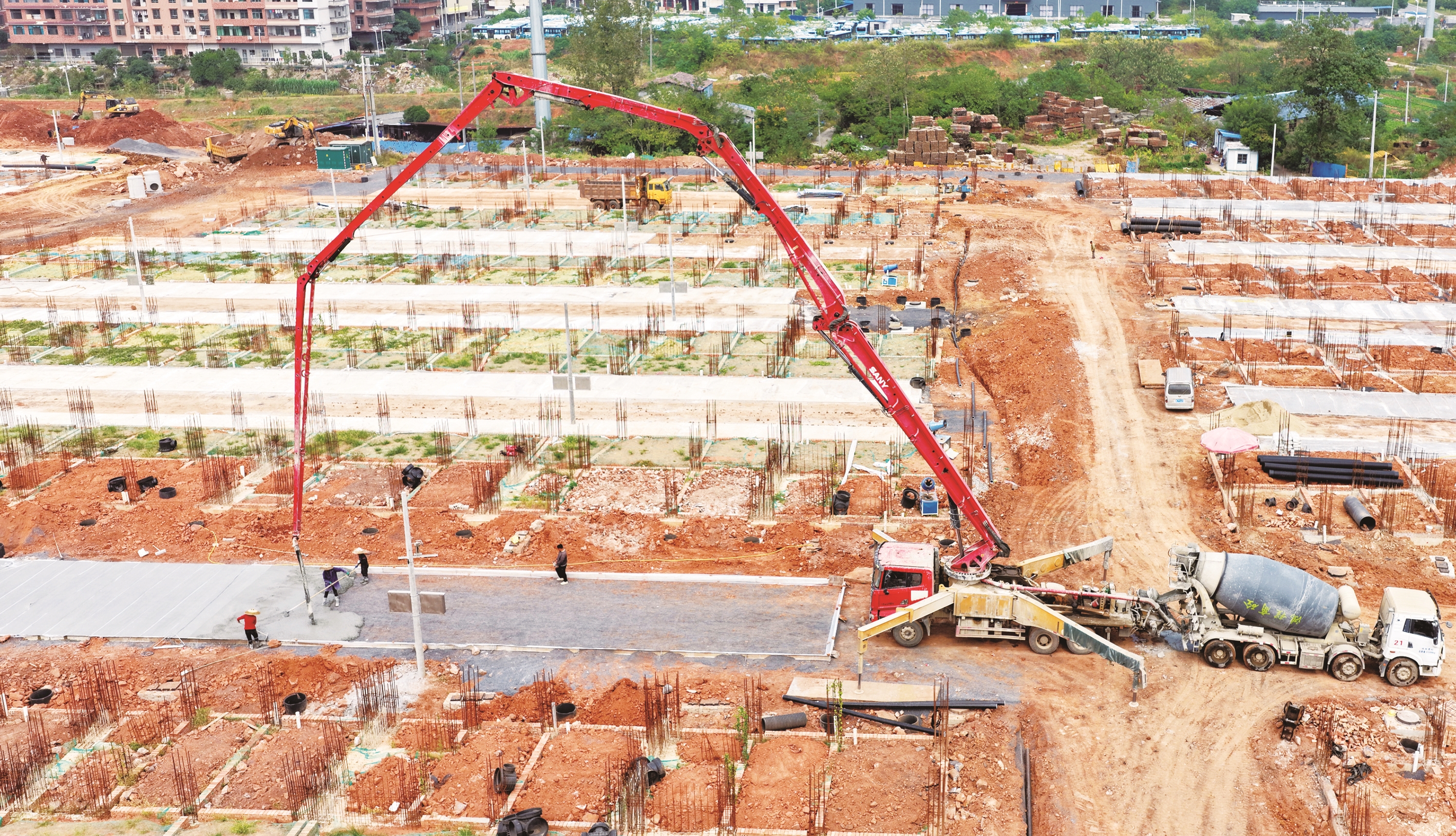 “往左一点,再过来一车。”10月15日上午,在柘木三期安置地,邵阳城发集团旗下子公司的工人们正忙碌着,为即将贯穿小区的主干道做最后施工。巨大的泵车伸展着钢铁长臂,将混凝土源源不断地注入路基。搅拌车滚筒低沉旋转,与泵车马达的轰鸣交织成一首建设的交响曲。
