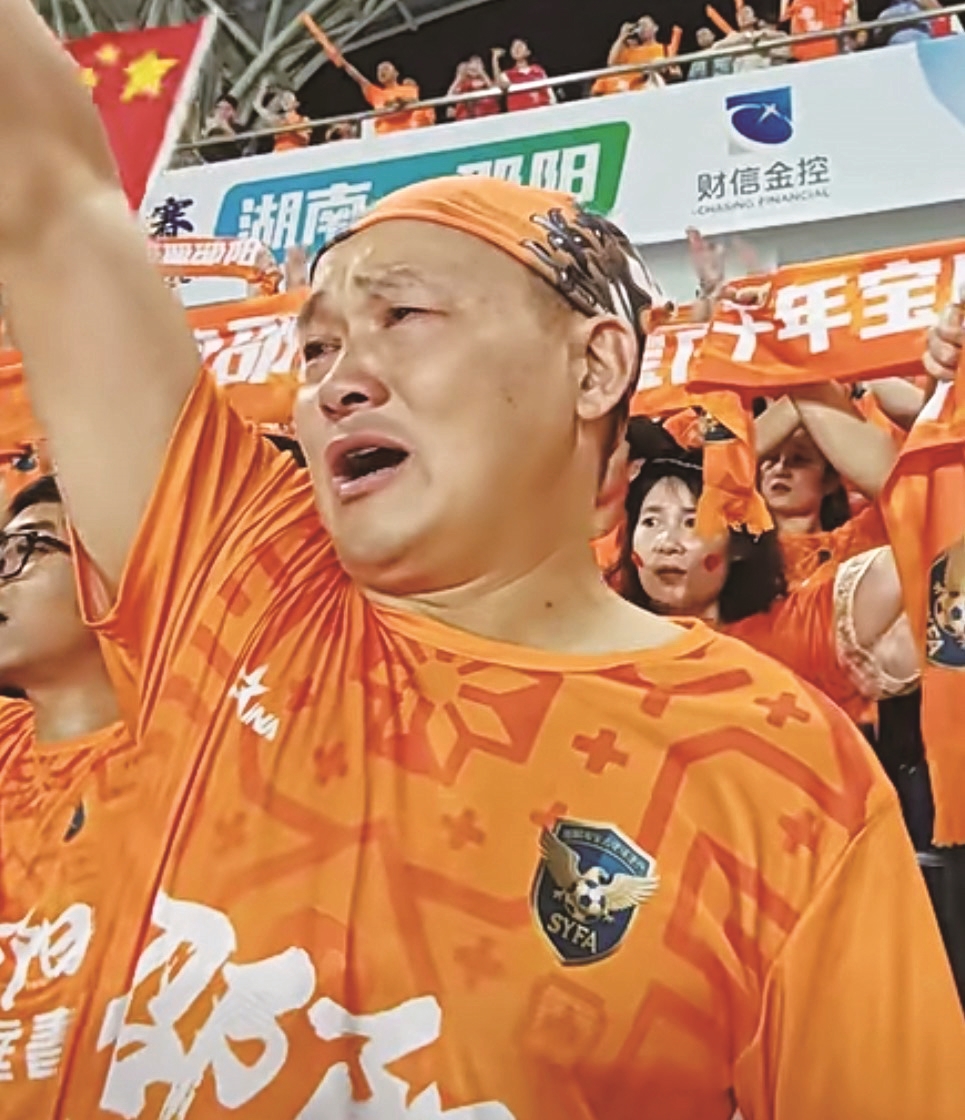 王勇在“湘超”比赛看台上为邵阳队燃情呐喊。